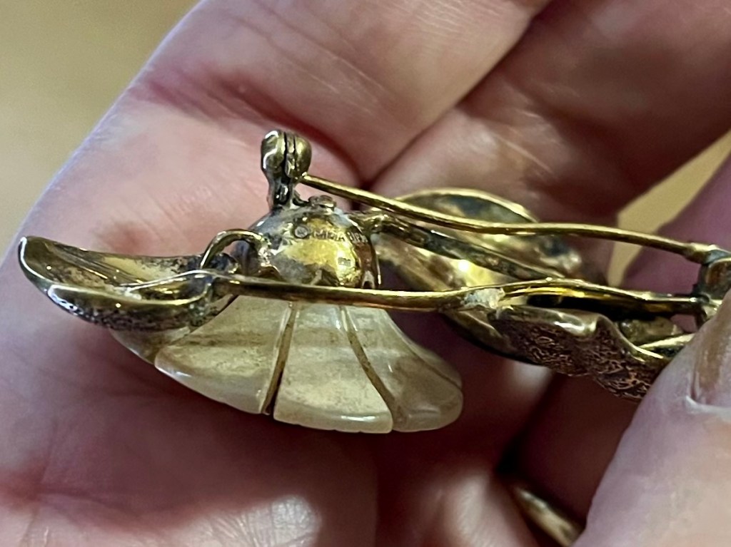 After a gentle clean-up at home, research into the brooch began in earnest. My trusty magnifying glass revealed a series of hallmarks – 925 UPM MMA – the 925 indicating gold-plated sterling silver. The other materials were mother of pearl, green enamel and garnet. Further research revealed that UPM stood for The Museum of Decorative Arts in Prague, and MMA for the Metropolitan Museum of Art in New York. This was very exciting and I immediately emailed the museum in Prague to see if they could help shed more light on the jewel.