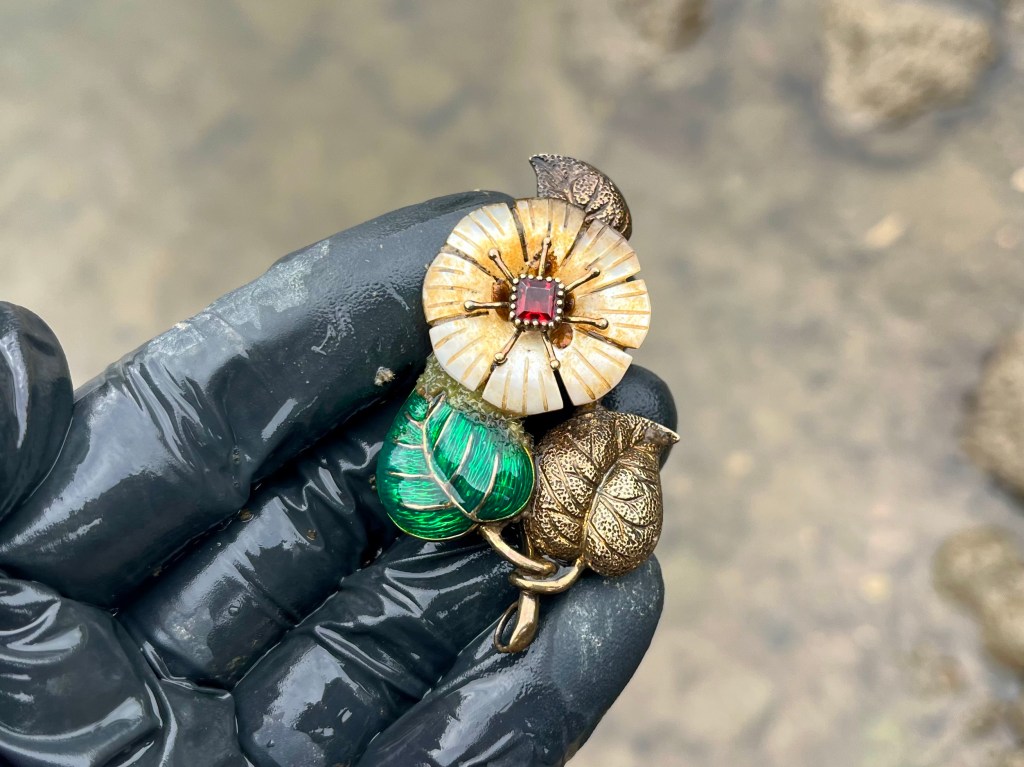 I knew I’d found something interesting and unexpected but wasn’t sure, at that stage, exactly what. A brooch of some sort, obviously, but clearly beautifully made to a very high standard using what appeared to me to be precious metals and semi-precious stones. It was also complete and undamaged, with a pin at the back. Taking it out of the river I gently removed a number of freshwater shrimps who’d made this their home over the decades, and re-housed them elsewhere in the water. There was quite a bit of mud in the nooks and crevices at the back of the brooch indicating this had been in the Thames for some time.