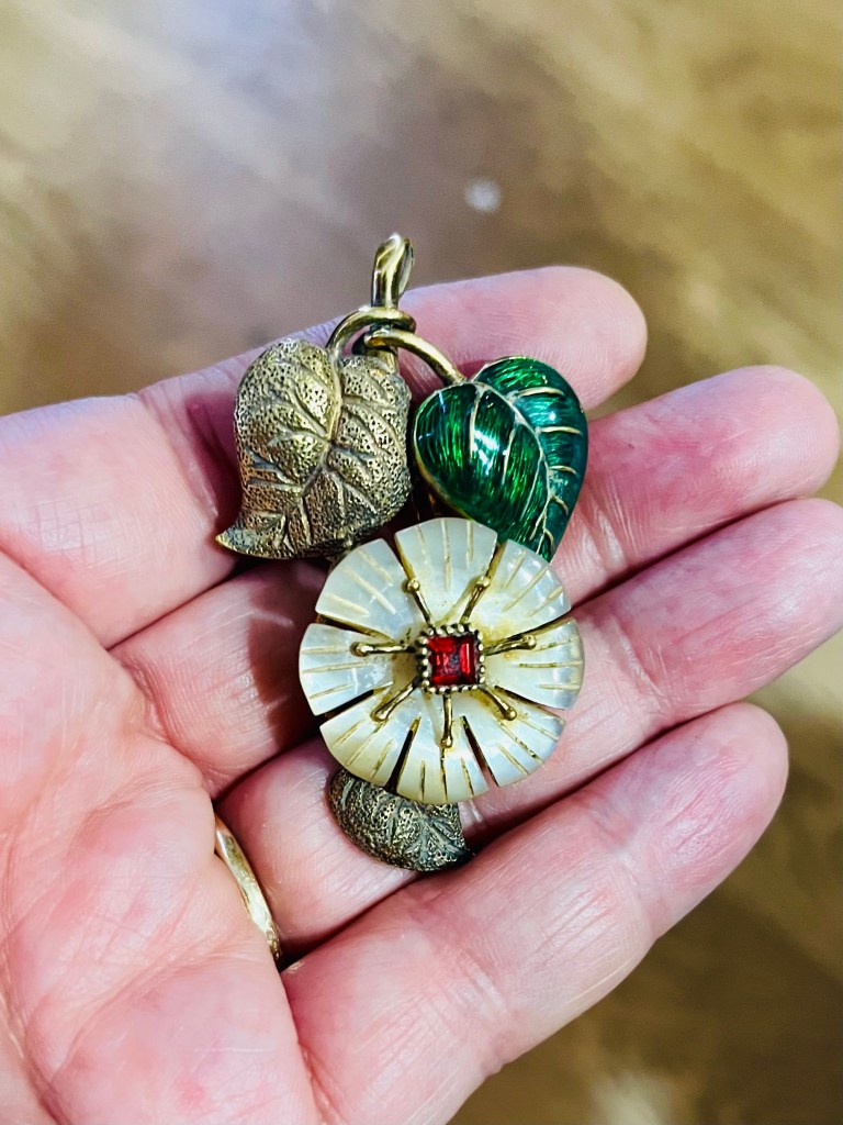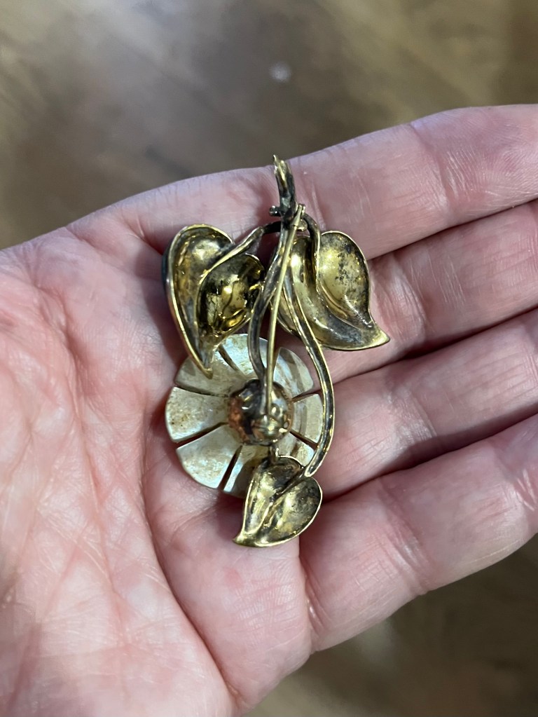 Front view of the brooch, before clean-up, showing gilded leaves, mother of pearl flower, garnet stone and green enamel leaf.
