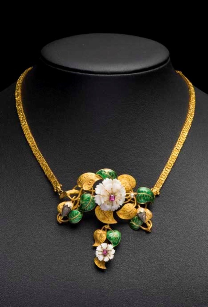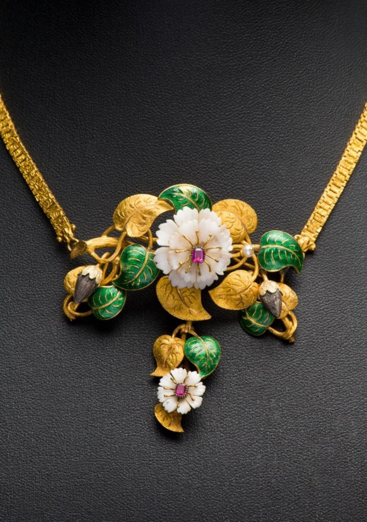 The original necklace, like so many beautiful things, would have been vulnerable during the Nazi occupation of Europe. It’s thought that it remained in private ownership and was eventually confiscated by Czech authorities after 1945 before transferring to the UPM in Prague in 1961. It has been on display here as part of an exhibition called ‘ART, LIFE.’ Dr Matějovič describes the necklace as a time capsule, symbolic of several stages of the life cycle of a plant. You can see this clearly in the way golden tendrils weave together the gold and enamel leaves, bejewelled flowers and seed pods.