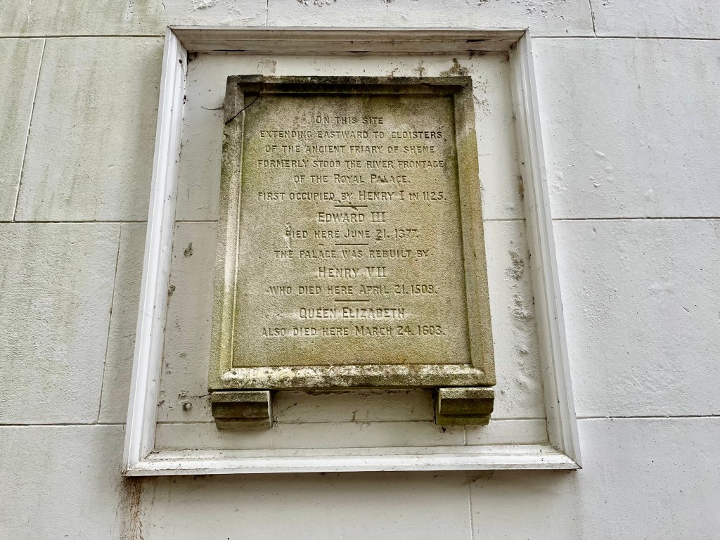 Stone monument showing details of the monarchs who lived and died at Richmond Palace, including Elizabeth 1, who died here on 24th March 1603.