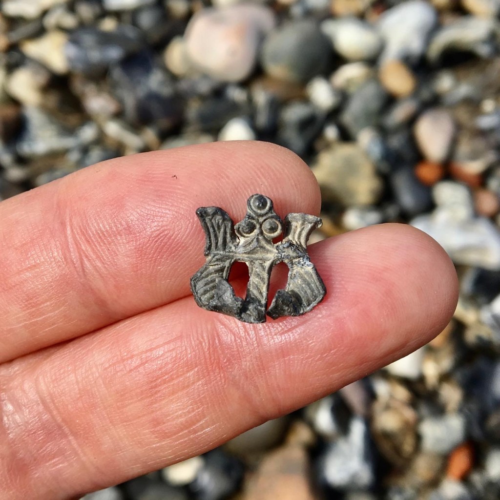 A large wave from a passing Thames Clipper caught me unawares (I will never learn to step out of the way quickly enough) and managed to fill my wellies with water. As the wash began to recede, I looked down and spotted a small pewter item at my feet. It definitely hadn’t been there a few minutes before. My reflexes were clearly very slow that day and the soggy feet weren’t helping. I remember standing on that spot, as if in a trance, while the wash continued to rush in and out again, carrying off the small item with it.