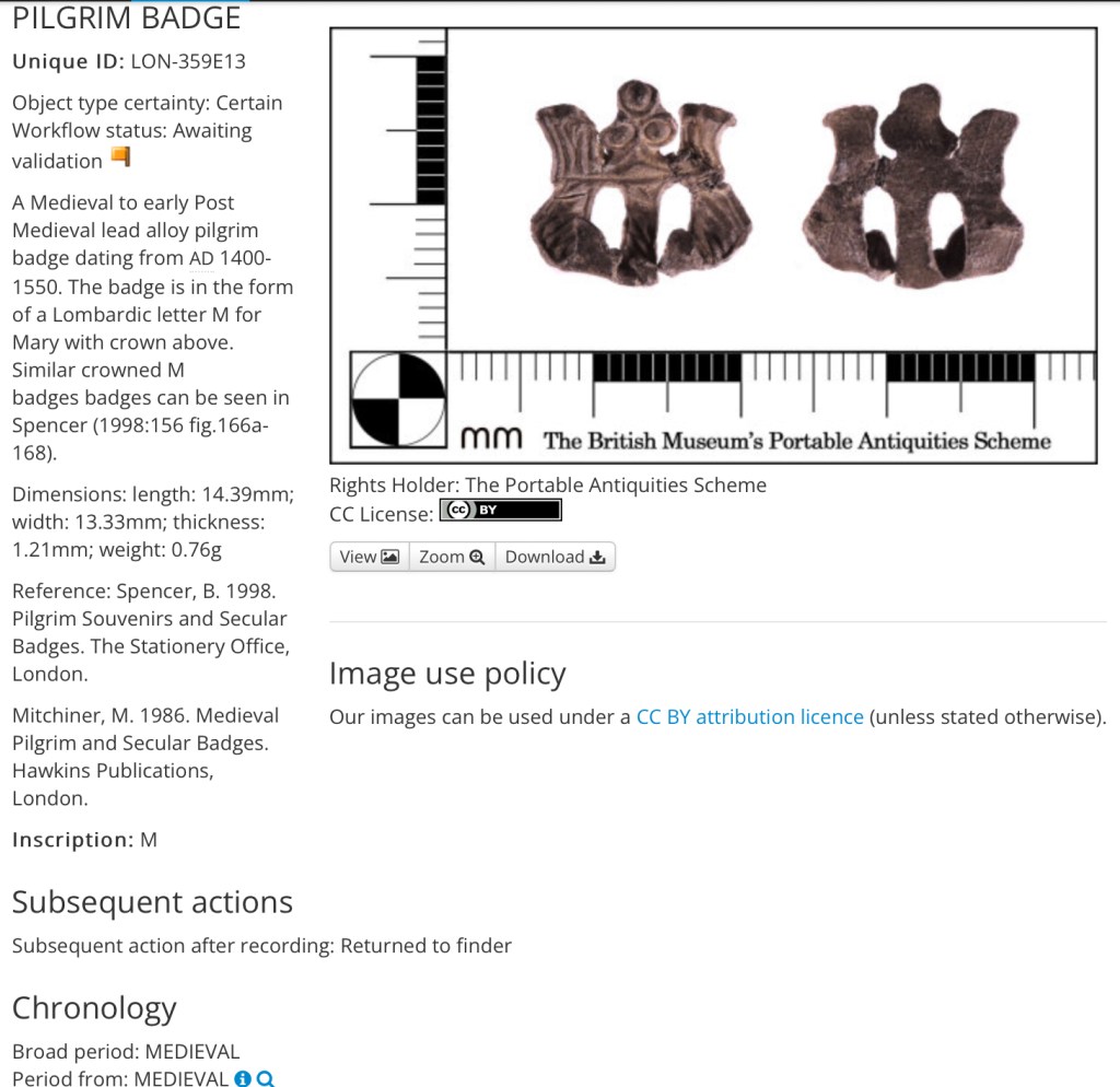 According to Brian Spencer, the ‘M’ was one of the most popular badges of Our Lady. Pilgrims would often buy more than one badge; to keep as souvenirs once blessed but also, it’s thought, although there is no written evidence anywhere from this period to confirm this, to throw into the Thames as an act of thanksgiving once they’d returned safely home.