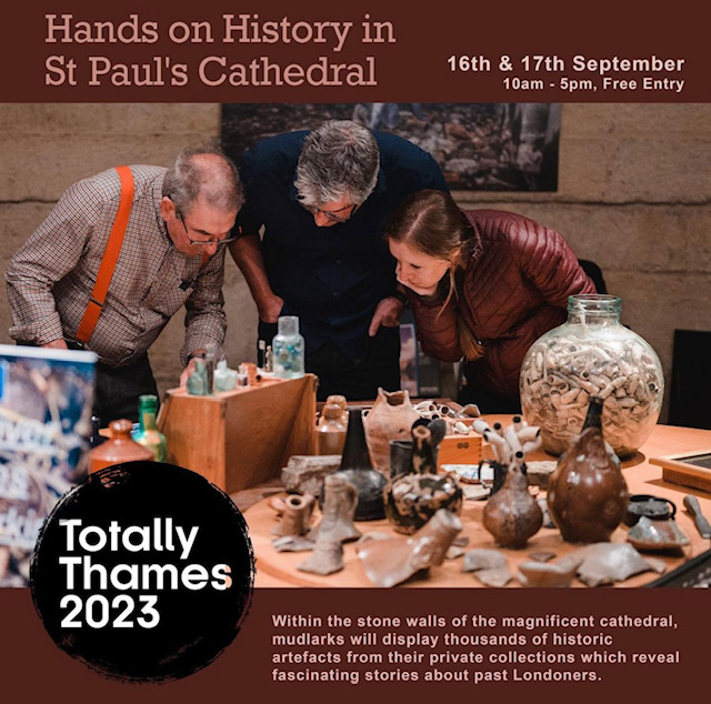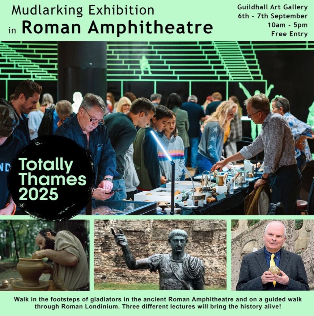 And I’m finishing this blog with a ‘save the date’ reminder. The first of our mudlarking exhibitions for Totally Thames 2025 will be taking place at the Guildhall Art Gallery in the City of London, on Saturday 6th September and Sunday 7th September (I’ll be exhibiting my finds on the 6th only.) If you’ve never visited, the Guildhall is the site of Londinium’s amphitheatre and a stunning building, the perfect setting for a mudlarking exhibition.