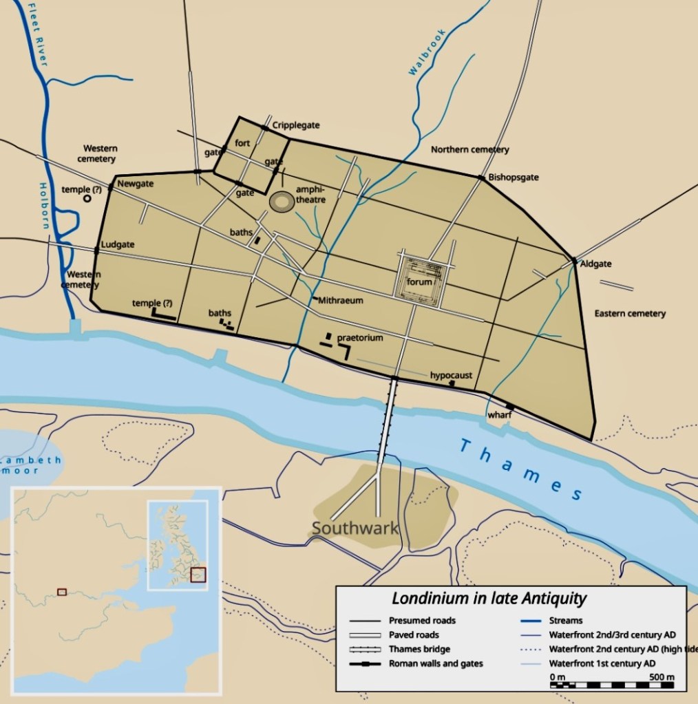 London and the Thames looked very different two thousand years ago. The south of the river was marshy, what we now know as Southwark was essentially two large gravel islands which formed the southern bridgehead for the original (Roman) London Bridge. Major roads were built here to connect to other Roman cities in the south of England e.g. Watling Street (connecting Londinium to Canterbury) and Stane Street (connecting Londinium to Chichester.) Museum of London Archaeology (MOLA) have carried out excavations in Southwark and archaeologists have found remains of high status stone buildings together with mosaics, hypocaust heating systems and painted wall frescos.