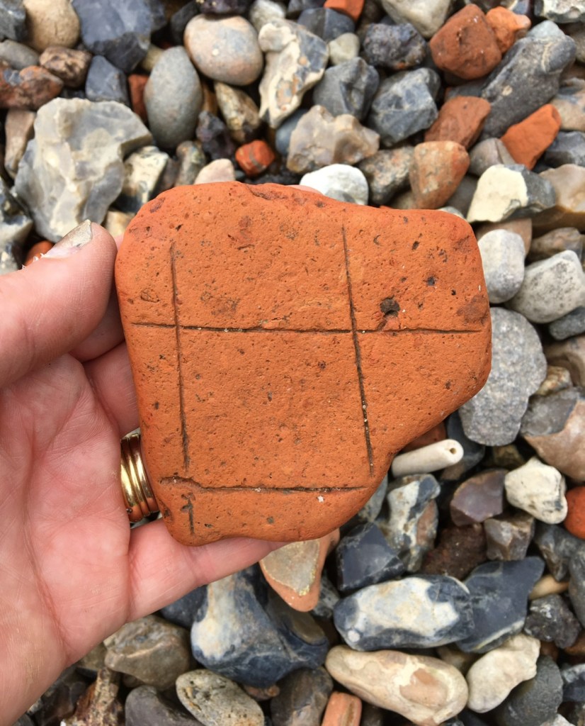 The river often plays games with us and coincidentally I found a worn, incomplete section of terracotta roof tile near where I’d found the bone gaming counter. I like to imagine someone beavering away making tiles and laying them out to dry in a courtyard. Boredom sets in and they idly mark a square piece of spare clay into a grid. Not a fancy gaming board that a high status individual or soldier might have used for the playing of Ludus Latrunculorum (similar to chess or draughts, the winner is the player who’s captured the most pieces) but a poor man’s or woman’s gaming board – functional, portable, will do the job. Something to while away the long hours in the tile maker’s yard when the boss wasn’t looking. That said, it’s impossible to tell if this is Roman clay; it could be later, but was found in an area of foreshore where Roman artefacts are found, and it’s the rich terracotta colour of the Roman era. I’ll never know, but it’s fun to let the imagination run riot and there’s no harm in speculating. And on this note, a third favourite mudlarking Insta recommendation is Peter (aka @ _tidetravel ) who writes in a much more evocative way about his mudlarked finds than I’ve done above, and really takes you back in time with his stories and descriptions of artefacts. He’s well worth a follow.
